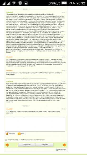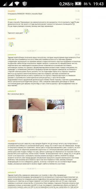 4.В вежливой форме и по существу я подробно изложила свои претензии,объсняя вам ,что так делать нельзя,что если покупатель интересуется,есть ли у б/у товара дефекты,нужно честно всё описать.И что получив вещь в таком виде,покупатель может поставить вам плохую оценку,имея на это все основания.Пояснила,что цена слишком высока для костюма с многочисленными деффектами.Если бы я знала реальное состояние ,я бы эту вещь не то,что за 1300,и за 1000,и за 800 не захотела бы!Если бы вы сразу извенились,и пояснили ,что каким-то чудным образом недоглядели...Так нет,вы мне в подробной форме описали,что всё это видели,и считаете это абсолютно нормальным.При этом не предложили как-то смягчить эту неприятную ситуацию снизив цену,или же сделать возврат с погашением расходов НП.(А это 67+67=134 гр!)Вы мне написали ,что возврат за мой счёт!На каком основании я по вашей вине должна выкинуть на ветер 134 гривны?!