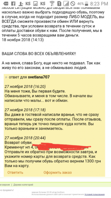 Нехотя на ответы? Вы 2е суток задавали то что есть в описании, пока мы не продали пару, как мне не хотелось продавать Вам вот это правда!, но нет я все таки нашла Вам пару которую Вы требовали, о чем1000р пожалела, я ведь читала Ваши отзывы и понимала что так будет. С начала вы оформили заказ и решили сами установить цену на 100грн меньше даже не спросив об уступки, естественно заказ я отменила, в это время мы продали эту пару 41р на другом сайте. Потом Вы оформляли заказ 3 раза под чужой фамилией именем и номером тел. Куда мы и отправили, оказывается Вы даже не знаете этого человека, как как ну как так? Ладно исправили Вам все на нп, и тут бонус опалиные ботинки Возврат я не приняла только по 1 причине Вы палили обувь огнём ЗАЧЕМ?? да кто в 21веке так проверяет нат.кожа или нет, она ведь обработана и на фото прекрасно видно что это кожаная обувь, да и если ребёнок померял а они малы, надо было просто вернуть а не палить их а потом в переписке проклинать...это ужас.