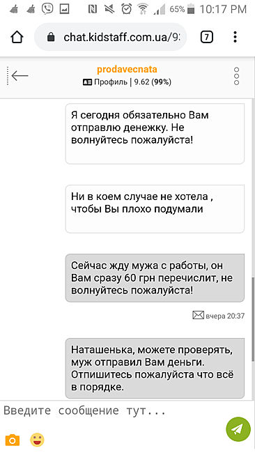 Вы шутите сейчас ? .. За 60 грн Вы решили мне рейтинг испортить?! Это смешно, вот правда. Пару дней назад мой муж другому продавцу отправлял деньги в сумме 2300 грн, про Ваш платёж в 60 грн видимо забыл. Я была спокойна, поскольку не проконтролировала этот момент. Совести у Вас не хватает, бессовестная Вы . Оставьте себе эти несчастные 60 грн детям на шоколадку. Очень не приятно, что связалась с таким не адекватным продавцом. Фото прилагаю.