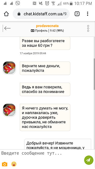 P.S. продавец не адекватный, не отписался в итоге ни о том, что посылка отправлена с номером посылки ,ни о том что получила мои деньги на карту.