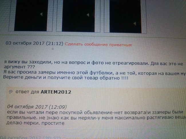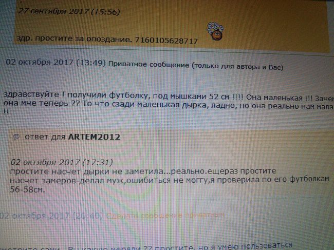 Покупала футболку БУ, спросила замеры, сказали ПОГ 58 см. Муж носит 59-60, т. е с учетом на потянется, меня устроило. Мало того, что пришло с дыркой ( хотя в объявлении было указано идеальное состояние и одето пару раз). Но то такэ как говорят. Брали в гараж, ладно. НО ПОГ !!!! 52 см !!! Она мне говорит, не может быть, у мужа моего все на 58 см. Спрашиваю, на какой мне знать какие футбы носит твой муж ?? я спрашивала за конкретную вещь !!! Возвращать не хочет. Деньги на ветер. Желаю, чтоб они ее стали ребром поперек горла !