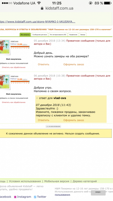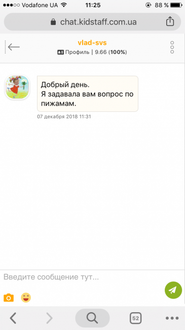 Никогда не писала никому ничего такого в гостевой, но тут я обязана написать ответ на отзыв в моей гостевой. Будьте осторожны если к вам обращается этот покупатель, так как если вы не ответите сразу, не важно уехали вы или болеете, вы получите негативный отзыв в своей гостевой без причины, просто что вы не ответили в тот срок, в который этому покупателю хотелось бы. Лично я уезжала заграницу и первое смс получила 5.12 в обед, 6.12 поздно ночью вернулась домой, 7.12 утром отвезла ребенка в школу и села отвечать на все вопросы за 3 дня, в том числе и этой девушке ответила. Пижамки, которые девушка спрашивала, оказались проданы, так как одна клиентка взяла 2 пижамки разных размера последние и мы заканчивали переписку в той темке, поэтому удалить я ее не могла еще, о чем этой девушке и написала. Но видимо человеку этим я причинила столько неприятностей и неудобств, что она удостоила меня негативным отзывом в гостевой. Лично для меня это никогда не послужило бы причиной писать такое в гостевых, но раз меня удостоили этому, пишу свой ответ.